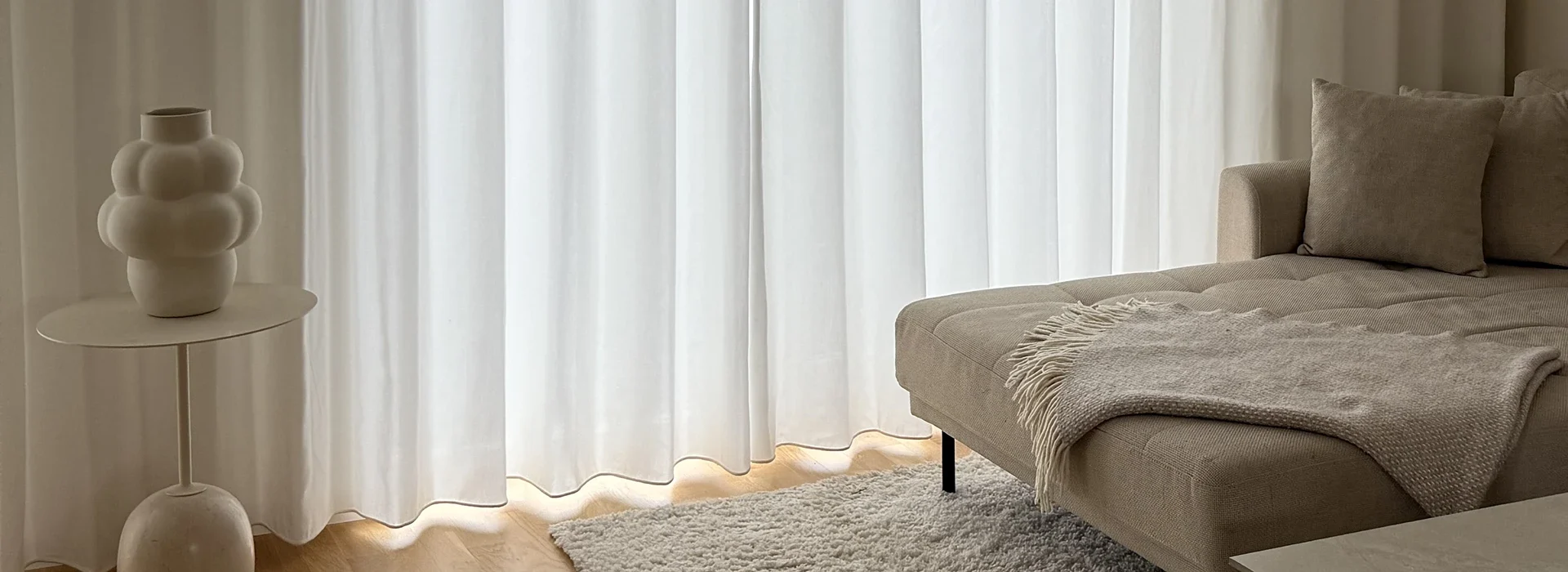 Tide kombinerer lethed med en diskret struktur, der giver stoffet en varm og indbydende karakter. Det filtrerer lyset på en blød måde og skaber en afslappet stemning, som passer godt i rum, hvor der ønskes et naturligt og roligt udtryk.